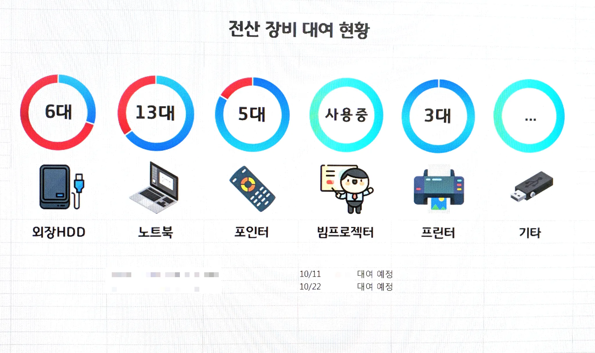 반복되는 업무 중에서 전산 장비나 포인터와 같은 주변기기를 대여하는 일이 많았다. 대여자는 어떤 구성품이 들어 있는지 인지하기 쉽지 않은 상태여서 물건을 반납할 때 하나씩 빠뜨리고 제출하는 분들도 있었다. 주의사항을 간략하게 뽑아서 넣어 두면 물건 관리가 쉬울 것이라고 생각했다. 그리고 대여할 때는 장부를 작성했는데 그것만으로는 전산 장비가 어디로 가 있는지 확인하기가 어려웠다. 그래서 엑셀 시트로 관리하면서 현재 몇 대가 대여 중인지 한눈에 보여주는 대시보드를 만들었다(이때부터 프론트엔드 기질이 보였던 걸까). 크게 도전적인 일이 없어서 방황할 때는 조금이라도 일을 효율적으로 할 수 있는 방법을 고민했다.