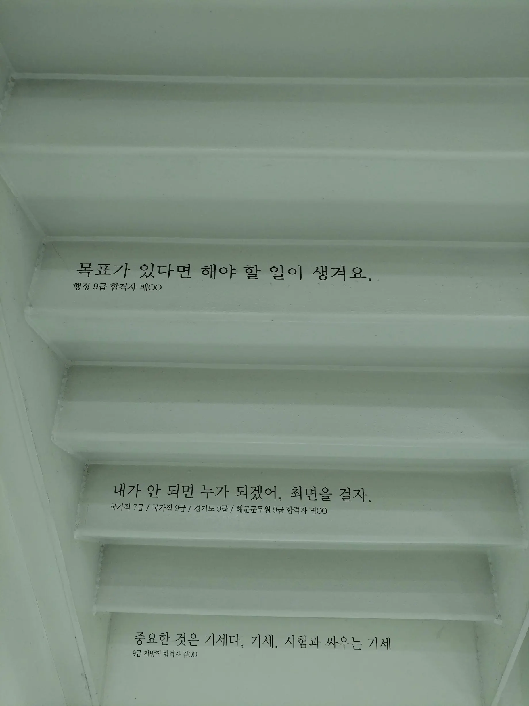공부를 하면서도 군무원 동기들의 직장생활을 떠올려 봤다. 나와 달리, 동기들은 근무하면서 연차가 쌓이는데 나는 제자리로 돌아온 것이 마음에 걸렸다. 조급한 마음이 들 때면 항상 이 생각이 나를 힘들게 했다. 혼자서만 공부하기보다는 같은 상황에 놓인 사람들과 함께 공부한다면 위로가 되지 않을까 하여 시험이 임박했을 때 컴퓨터 일반과 정보보호론 과목은 오프라인 강좌를 수강했다. 함께 공부하는 수강생과 선생님과 대면하면 덜 힘들 거라고 생각했다. 그렇게 노량진 수험 현장에 발을 들였더니 합격을 기원하며 하루 빨리 이 자리를 뜨길 소망하는 사람들이 많았다. 커피를 사러 카페에 들렀는데 합격 염원으로 찬 포스트잇이 가득했다.