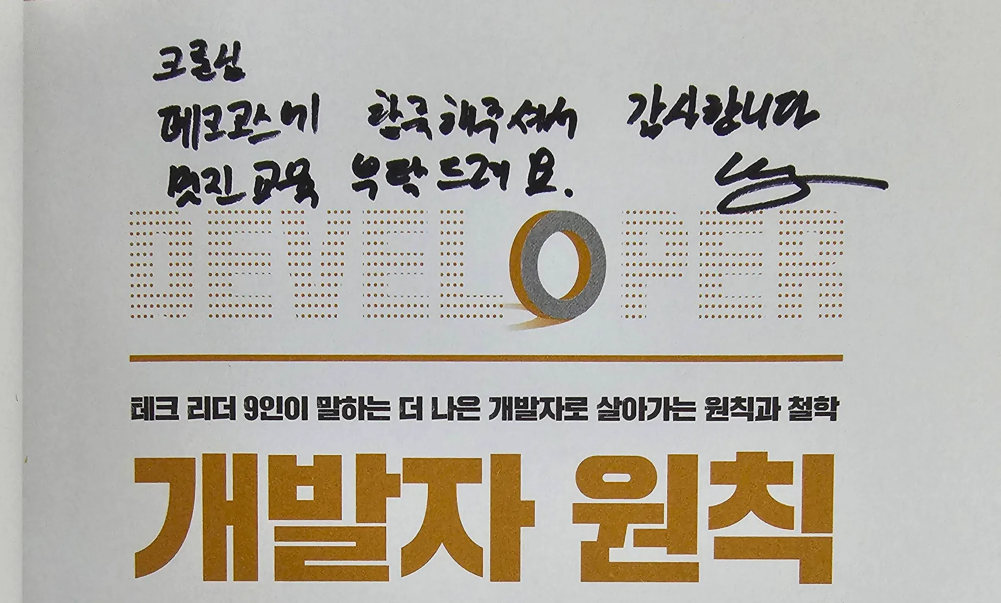 마침 얼마 전에 개발바닥 ‘향로’의 이동욱님께서 우아한테크코스 크루를 대상으로 “건강하게 나아지기”라는 주제로 특강을 하시러 방문하셨었다. 내용 중에서는 루틴한 생활을 가져가야 한다고 말씀해 주셨던 부분이 있었다. 커리어 궤적이 나와 비슷하시다고 느꼈는데 마침 루틴한 생활과 관련된 부분도 비슷한 점이 있어 동질감을 느꼈다. 강연이 끝나고 코치님들과 함께 하는 식사 자리에서 어렵게 싸인을 받았다