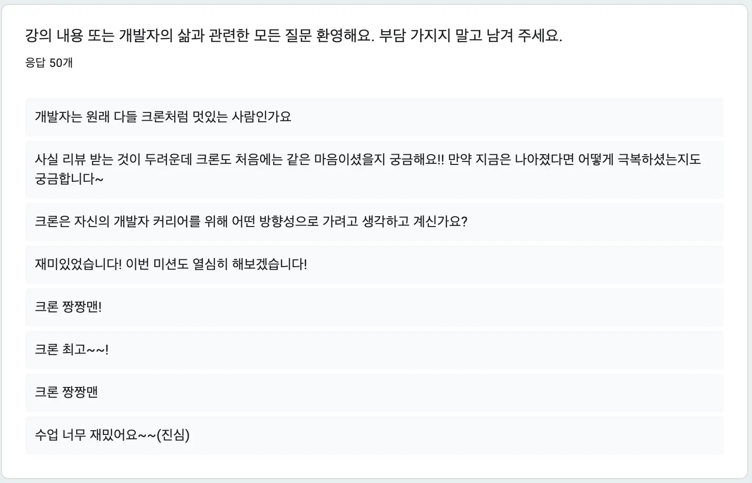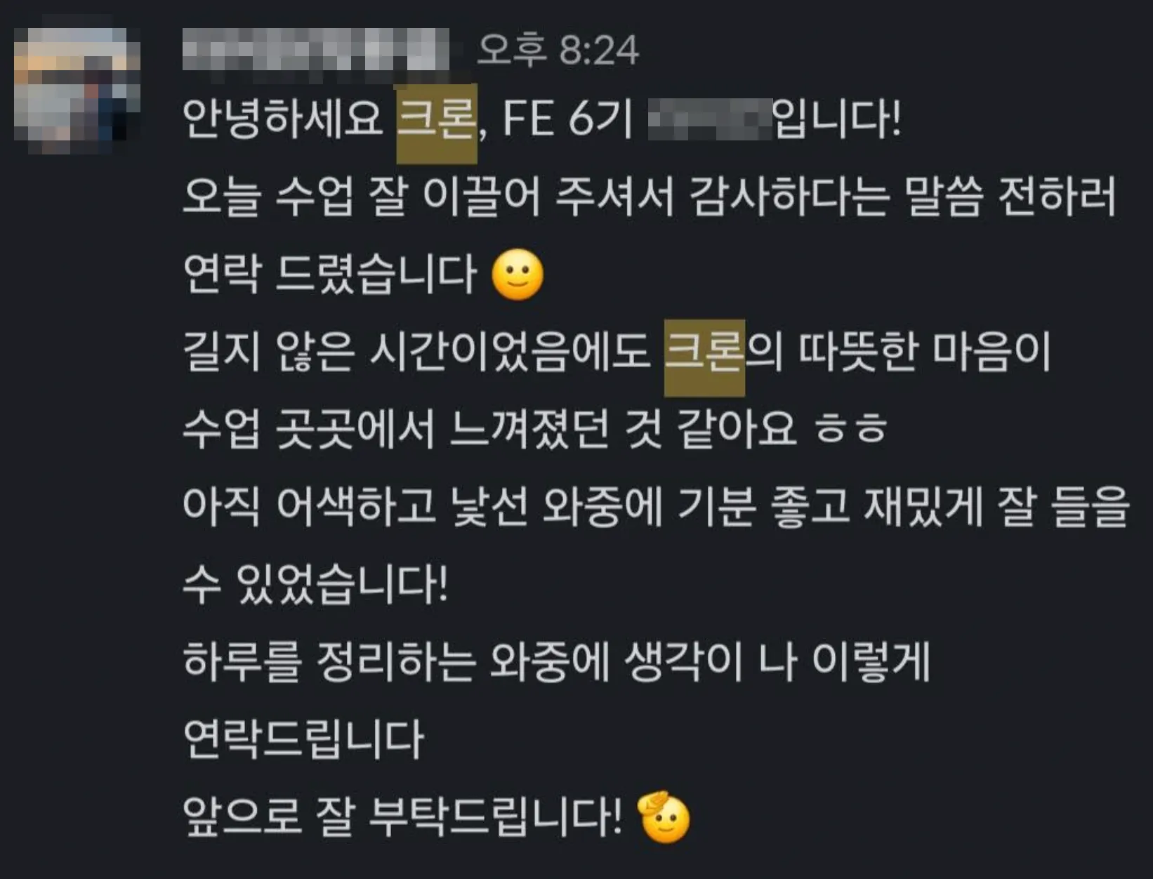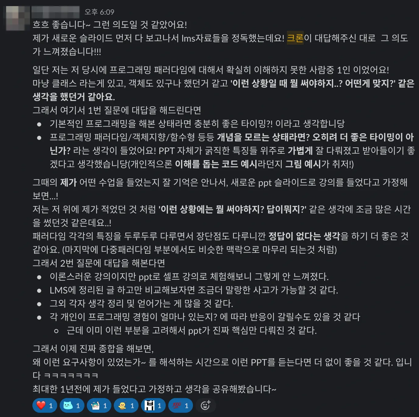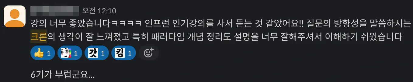 지난 기수 크루에게 피드백을 요청하려고 강의 녹화본을 공유했는데 긍정적인 피드백을 받았다.