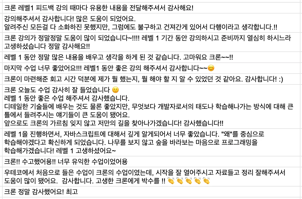 그리고 교육을 마치고 나서 받은 마지막 피드백. 앞으로 교육생들이 다음 레벨에 가서도 지금의 학습법으로 충분히 성장을 이뤘으면 좋겠다